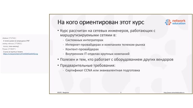 Материал курса разбирается с лабораторными работами на оборудовании Cisco. В курсе разбираются все темы, проверяемые на сертификационном экзамене 300-101 (Cisco ROUTE 2.0), необходимом для получения сертификации CCNP (Cisco Certified Network Professional).